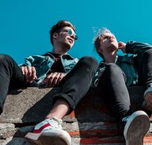 Happy young loving couple outside with backpack in